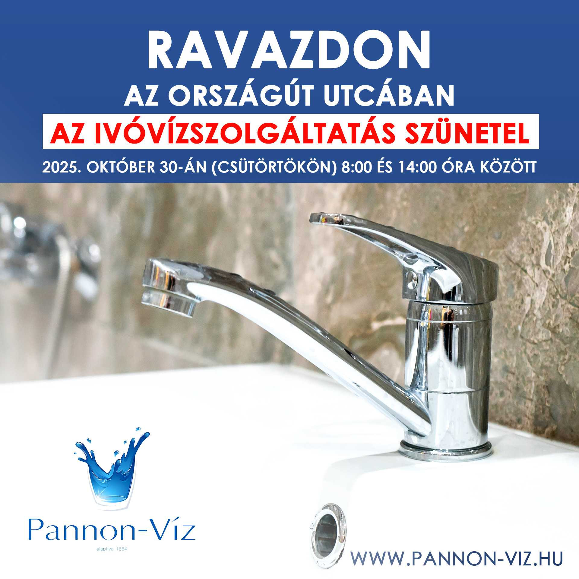 Csütörtökön ivóvízhálózat rekonstrukciót végez Ravazd településen a Pannon-Víz, a munkálatok miatt az ivóvízszolgáltatás szünetelésére kell számítani.