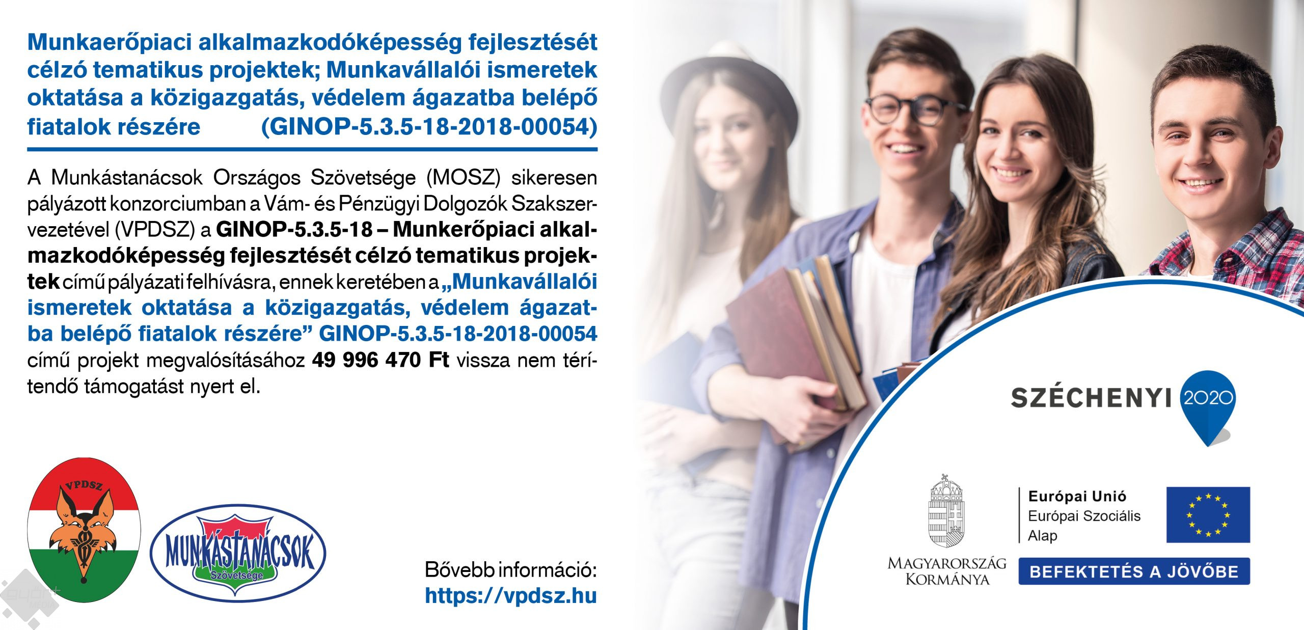 A Munkástanácsok Országos Szövetsége (MOSZ) sikeresen pályázott konzorciumban a Vám -és Pénzügyi Dolgozók Szakszervezetével (VPDSZ) a GINOP-5.3.5-18 – Munkerőpiaci alkalmazkodóképesség fejlesztését célzó tematikus projektek című pályázati felhívásra, ennek keretében a „Munkavállalói ismeretek oktatása a közigazgatás, védelem ágazatba belépő fiatalok részére” GINOP-5.3.5-18-2018-00054 című projekt megvalósításához 49 996 470 Ft vissza nem térítendő támogatást nyert el.