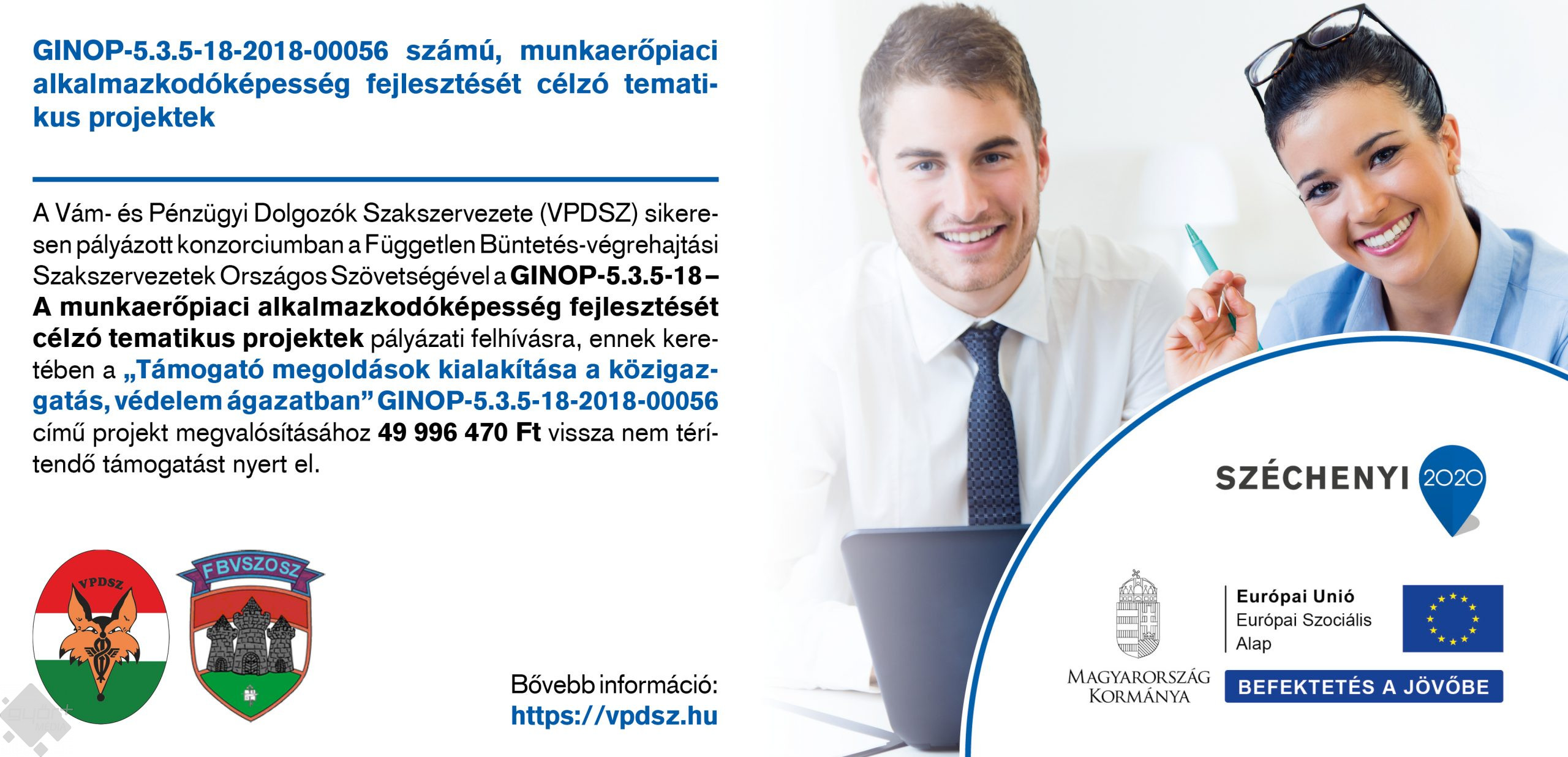 A Vám-és Pénzügyi Dolgozók Szakszervezete (VPDSZ) sikeresen pályázott konzorciumban a Független Büntetés-végrehajtási Szakszervezetek Országos Szövetségével GINOP-5.3.5-18 – A munkaerőpiaci alkalmazkodóképesség fejlesztését célzó tematikus projektek pályázati felhívásra, ennek keretében a „Támogató megoldások kialakítása a közigazgatás, védelem ágazatban” GINOP-5.3.5-18-2018-00056 című projekt megvalósításához 49 996 470 Ft vissza nem térítendő támogatást nyert el.