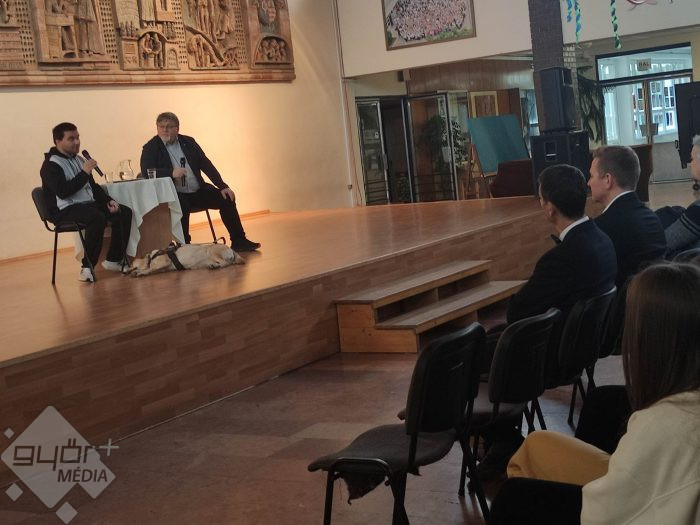 Érzékenyítés keretében 2023.02.23-án a Győri SZC Móra Ferenc Általános Iskola 7. és 8. osztályos tanulói megismerkedhettek a látássérült Fóris Norberttel és kutyájával, Gyömbérrel.