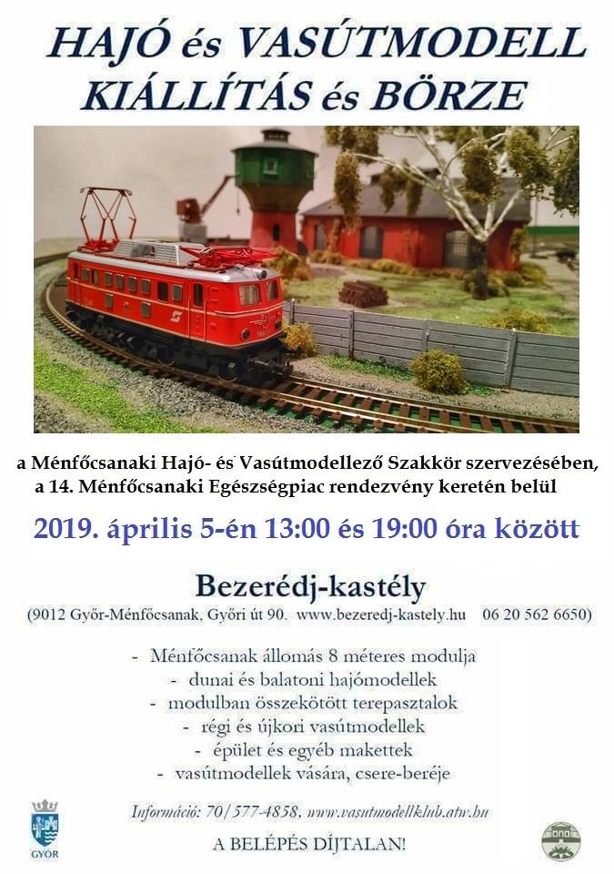 Vasútmodellező terepasztalok és hajómodellek kiállítása lesz április 5-én szombaton 13-tól 19 óráig a Bezerédj-kastélyban (Győr, Győri út 90.).