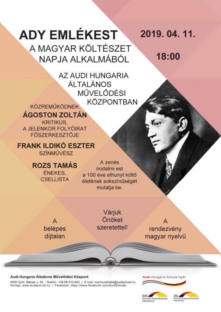 Ady emlékestet tartanak április 11-én 18 órakor az Audi Hungaria Általános Művelődési Központban (Győr, Bácsai út 55.)