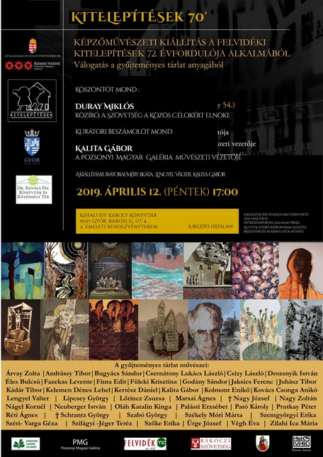 Kitelepítések 70 címmel képzőművészeti kiállítás nyílik a felvidéki kitelepítések 70. évfordulója alkalmából április 12-én, pénteken 17 órakor a a Kisfaludy Károly Könyvtárban (Győr, Baross u. 4.).