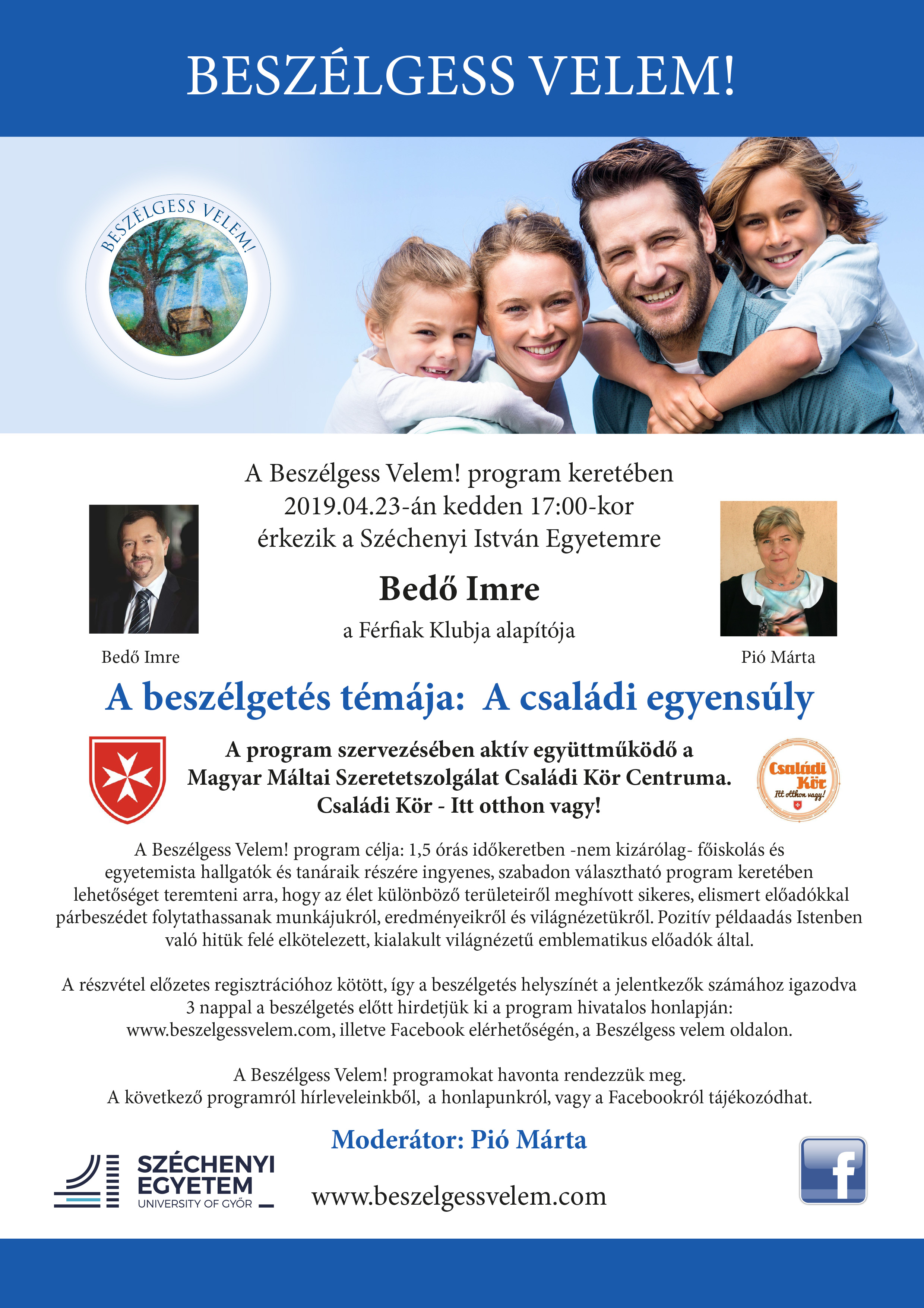 "A családi egyensúly" címmel tart előadást Bedő Imre, a Férfiak Klubja alapítója Győrben, a Széchenyi István Egyetem új épület konferenciatermében április 23-án, kedden 17 órától.