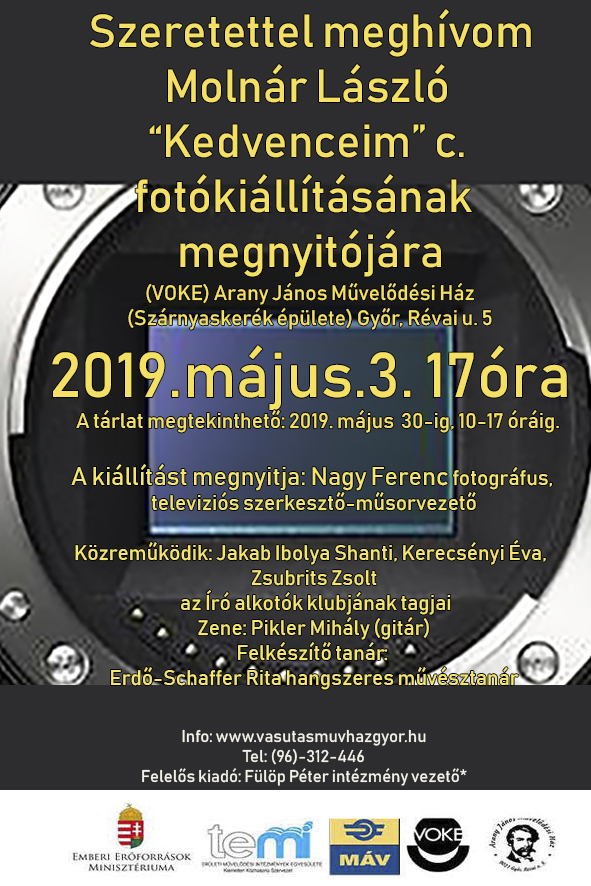 Molnár László fotóművész „Kedvenceim” című kiállítása nyílik május 3-án (pénteken) 17 órakor a győri (VOKE) Arany János Művelődési Ház galériájában (Révai u. 5.).