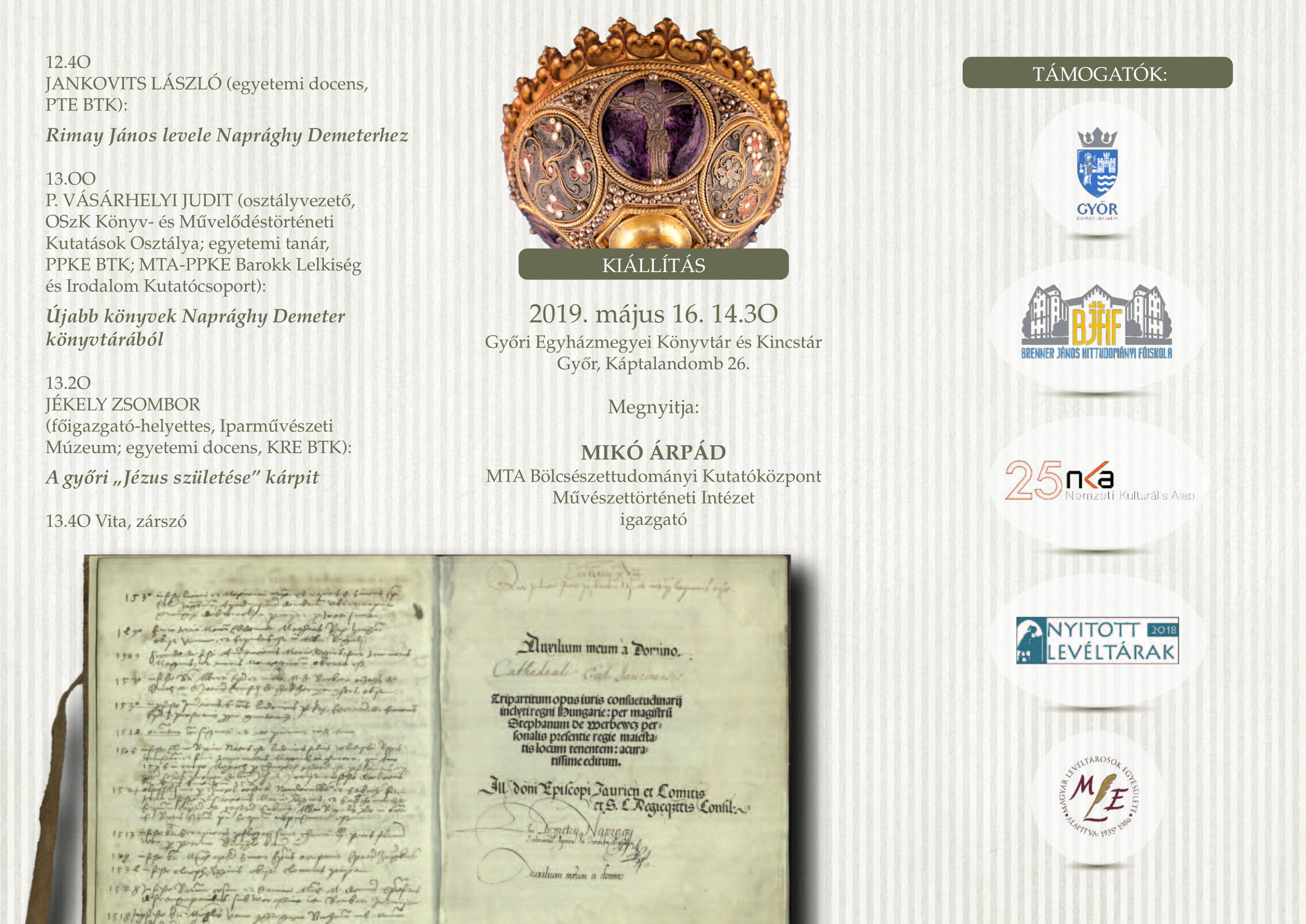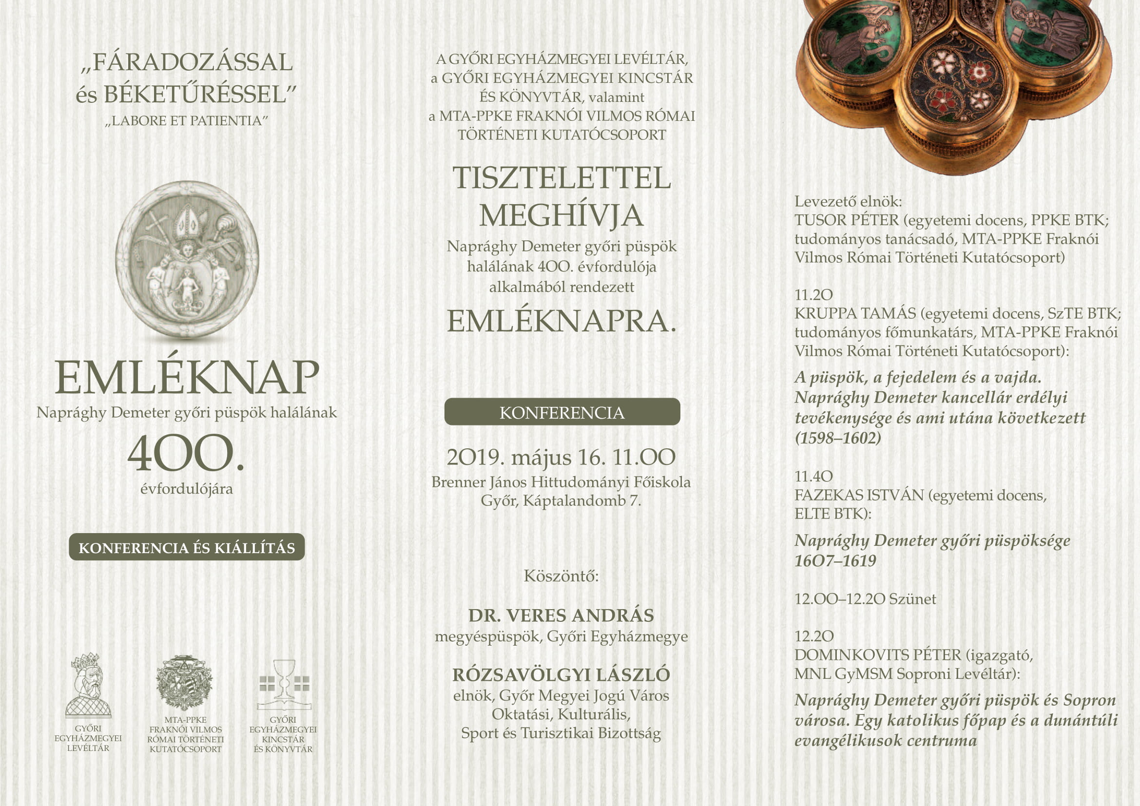 A Győri Egyházmegyei Levéltár, a Győri Egyházmegyei Kincstár és Könyvtár, valamint a MTA-PPKE Fraknói Vilmos Római Történeti Kutatócsoport által szervezett konferencia május 16-án 11 órakor kezdődik a Brenner János Hittudományi Főiskolán (Győr, Káptalandomb 7.), a kiállítás megnyitója 14.30-kor lesz a Győri Egyházmegyei Könyvtár és Kincstárban (Káptalandomb 26.).