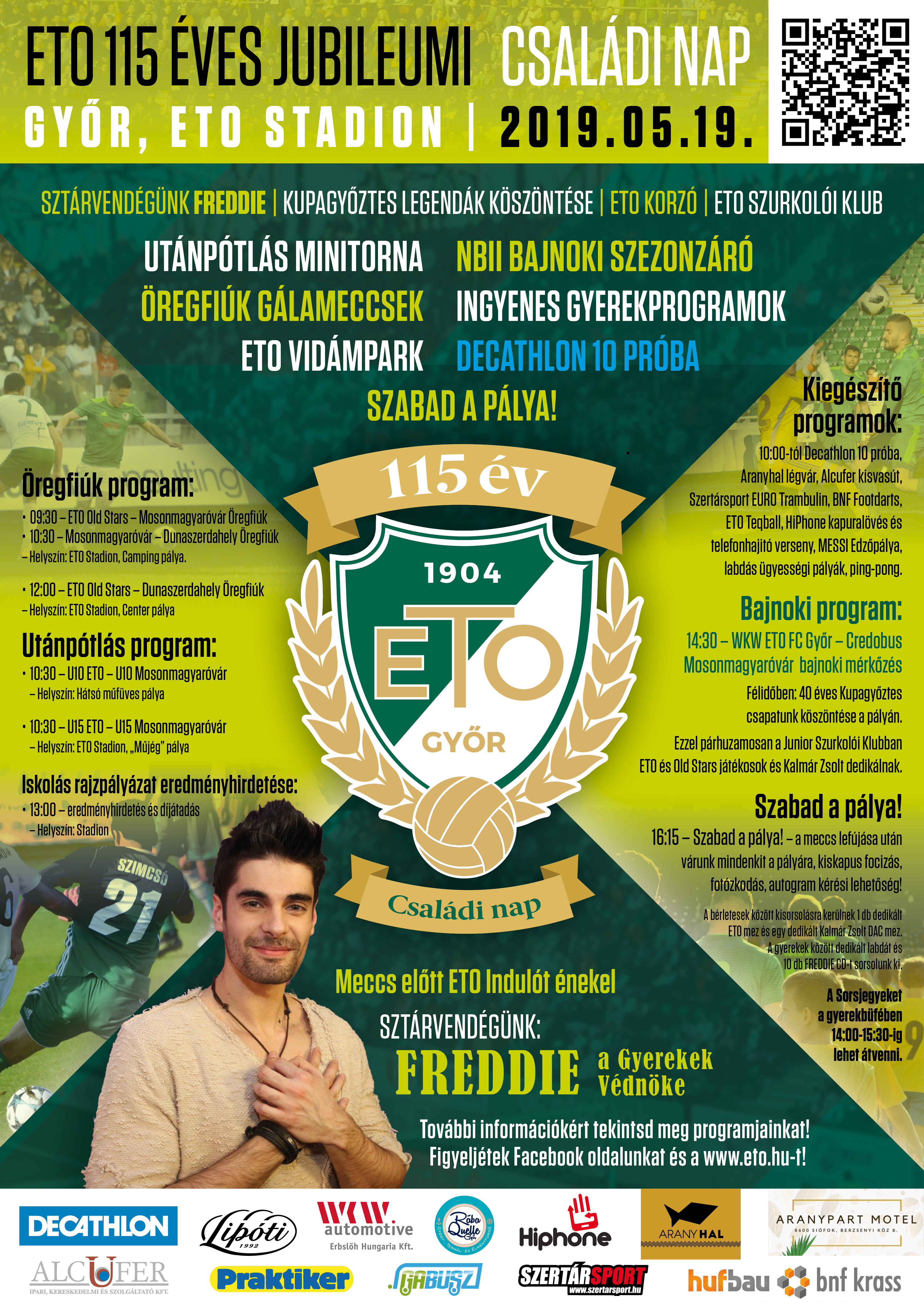 S hogy ki lehet az a 15 szerencsés diák? Nos, a szervezők egy 13+1-es klasszikus totó játékkal készülnek az iskolás gyerekeknek, amit hamarosan eljuttatnak a győri iskolákba. A totót helyesen kitöltő diákok közül 15 főt sorsolnak majd ki, akik ráadásul Freddie-vel közösen nézhetik a mérkőzést a Fehérvári Alfréd VIP páholyból, ahol sok finomsággal is kedveskednek majd nekik. A totó kizárólag 10-16 év közötti gyerekeknek szól, a játékszabályokat és a kérdéssort a klub hamarosan közzéteszi, ahogy a Jubileumi Családi Nap teljes, részletes programját is. Annyi már most is biztos, hogy május 19-én 10 órától tárja szélesre a kapuit a stadion, lesz utánpótlás minitorna, öregfiúk gálameccsek és még számos érdekes és tartalmas program, kicsiknek és nagyoknak egyaránt. A Jubileumi Családi Nap programjai és az aznapi mérkőzés mindenki számára ingyenes!