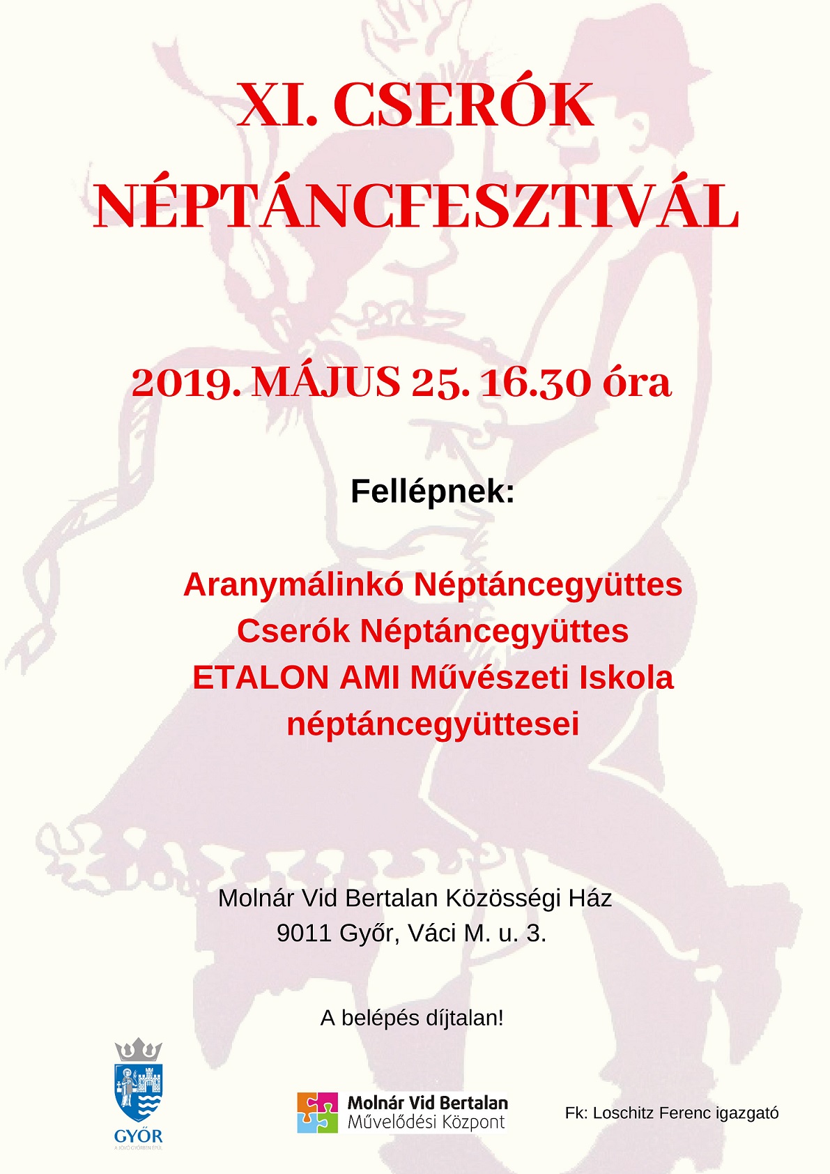 XI. alkalommal rendezik meg Győrszentivánon, a Molnár Vid Bertalan Közösségi Házban a Cserók Néptáncfesztivált, május 25-én 16 órától.