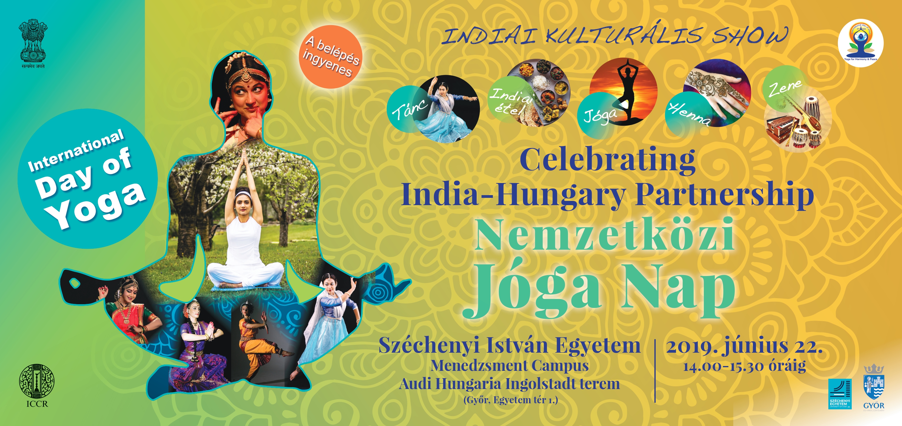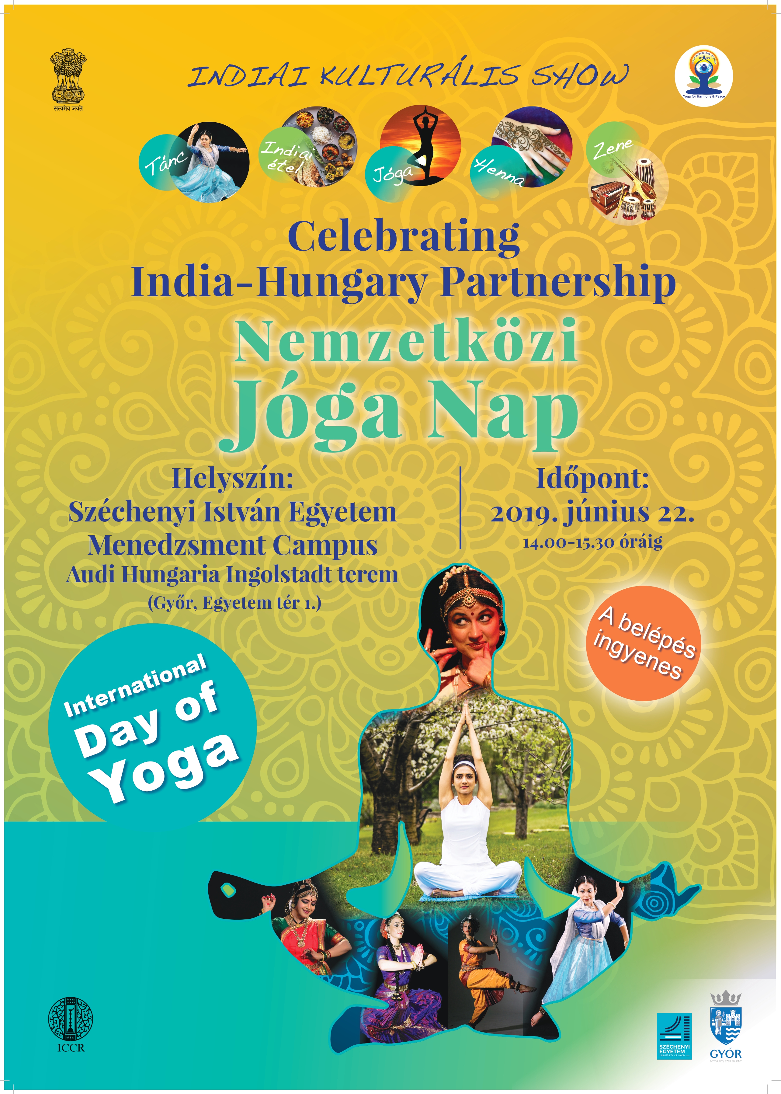 Az Indiai Nagykövetség . június 22-23-án ünnepli a Jóga 5. Nemzetközi Világnapját Magyarországon. Ez alkalomból egy különleges eseménysorozat bemutatására kerül sor Budapesten, Debrecenben, Alsóörsön, Békéscsabán, Pécsett, Szegeden, Mosonmagyaróváron, Egerben, Esztergomban, Győrött, Kecsekeméten, Somogyvámoson, Nyíregyházán, Sopronban, Szentendrén, Veszprémben és Zalakaroson, mely nem csupán a jóga hagyományát, de India kultúrájának vibráló sokszínűségét is színpadra állítja. Az Indiai Nagykövetség az idei év kulturális rendezvényét az India és Magyarország közötti diplomáciai kapcsolatok megalapításának 70. évfordulójára emlékezve rendezi meg.