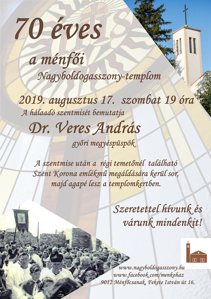 A ménfői Nagyboldogasszony-templom felszentelésének 70. évfordulója alkalmából Veres András győri megyéspüspök ünnepi szentmisét mutat be augusztus 17-én 19 órakor.