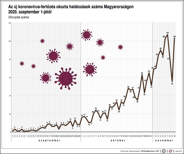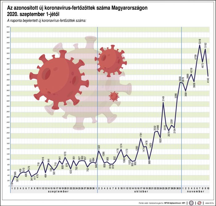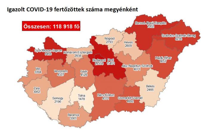 4140 újabb magyar állampolgárnál mutatták ki az új koronavírus-fertőzést (COVID-19), ezzel 118 918 főre nőtt a hazánkban beazonosított fertőzöttek száma. Elhunyt 103 többségében idős, krónikus beteg, így az elhunytak száma 2596 főre emelkedett, 27 585-en pedig már meggyógyultak. Az aktív fertőzöttek száma 88 737 fő. Az aktív fertőzöttek 24%-a, az elhunytak 28 %-a, a gyógyultak 28%-a budapesti. 6153 koronavírusos beteget ápolnak kórházban, közülük 461-en vannak lélegeztetőgépen.
