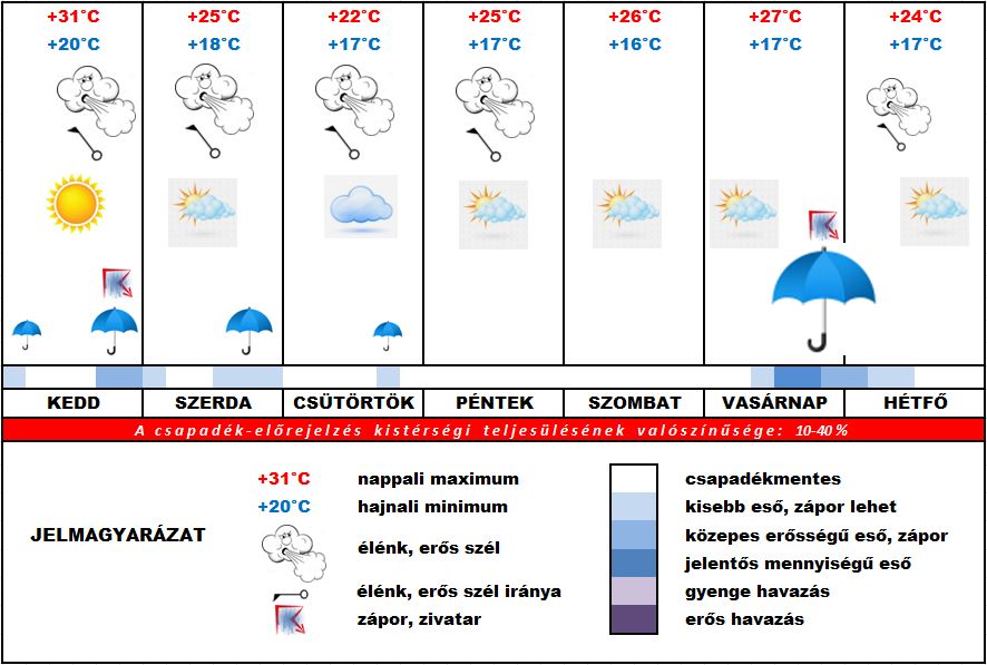 A kedd esti – szerda éjjeli órákban front halad át, nem zárható ki, hogy csapadék nélkül, de az sem, hogy heves zivatarral, ami biztos, hogy pár órára feltámad, viharossá fokozódik az ÉNy-i szél, s a hőmérséklet csökkenni kezd. Szerda délutántól vasárnap délutánig felhőátvonulások várhatók, időnként megerősödő ÉNy-i széllel, kisebb záporokkal, és az utóbbi napokénál lényegesen alacsonyabb nappali maximumokkal. A mélypont csütörtökre várható, csak kevéssel +20°C felett. A jelenlegi prognózisok szerint meglepően nagy biztonsággal vasárnap este, illetve hétfő éjjel több, mint 15 mm esőt hullató csapadéktömb vonul át a Kisalföld felett, bár az utóbbi hetek prognózisaira visszatekintve ezt nem merném biztosra venni. Mindenesetre a hétvégén emelkedő tendenciát mutató hőmérsékletben hétfőn újabb visszaesés várható.