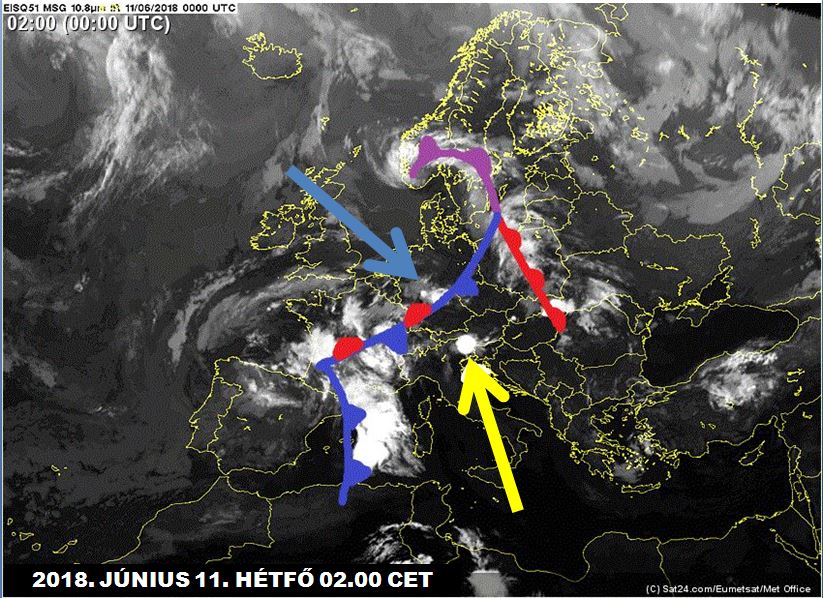 A 2. ábra hétfő hajnali infravörös műholdfelületén a zivatargócok rajzolják ki azt a hullámzó frontot, mely várhatóan keddről szerdára virradóra vonul át a Kisalföld felett (kék nyíl), heves eseményeket is kiválthatva.