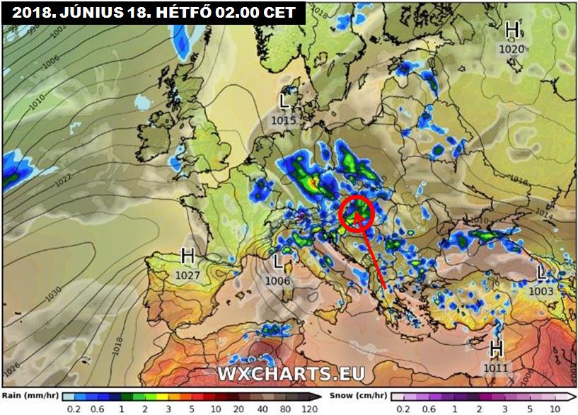 A 4. ábra jövő hétfő éjjel két órára teszi annak a csapadéktömbnek az áthaladását, mely a jelenlegi „állás szerint” alaposan eláztatja a Kisalföldet. A piros kör hazánk nyugati felét, a piros nyíl pedig Győr helyzetét jelöli. De várjuk ki a végét!