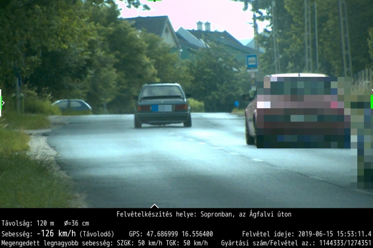 A Soproni Rendőrkapitányság Közlekedésrendészeti Osztály munkatársai sebességmérést végeztek 2019. június 15-én Sopronban az Ágfalvi úton. Az ellenőrzés idején egy BMW sofőrje az adott útszakaszra vonatkozó 50 km/h megengedett legnagyobb sebesség helyett 15 óra 53 perckor 126 km/h sebességgel közlekedett előzése során. A járművezető 300000 forint közigazgatási hatósági bírság és 8 büntetőpont kiszabására számíthat.