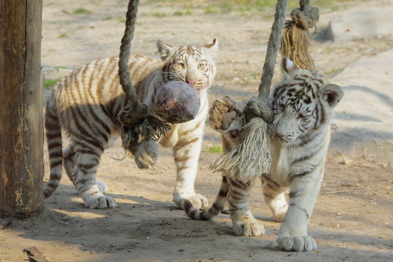 A kis tigrisek tréningje is folytatódik a szabad ég alatt, ahol gondozójukkal játékos formában erősítik meg a kötődést, és tanulják meg az emberekkel való helyes viselkedést. A tréning még a nyitás előtt kezdődik el, és természetesen ilyenkor csak a kölykök és a gondozójuk tartózkodhatnak a kifutóban. Új rágni való eszközöket és labdát is kaptak a kölykök, ezzel is gazdagítjuk a környezetüket, és izgalmas szórakozást nyújtunk a mindig játékos kedvű tigriseinknek. Erejük és ügyességük a játék közben is fejlődik, és az sem elhanyagolható szempont, hogy így hamarabb elfáradnak, és szüleiket sem nyúzzák annyit, megmaradhat a családi béke.