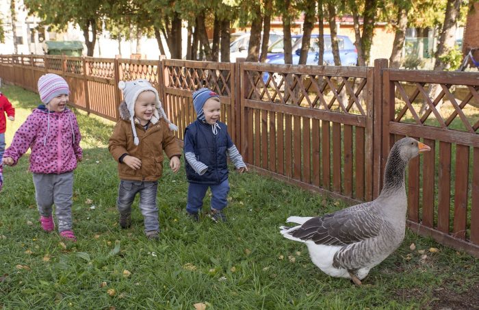 A gyerekek a lúddal és pónilóval ismerkedtek az állatok világnapja alkalmából szervezett programon a Győrszentiváni Bölcsődében 2019. október 4-én.