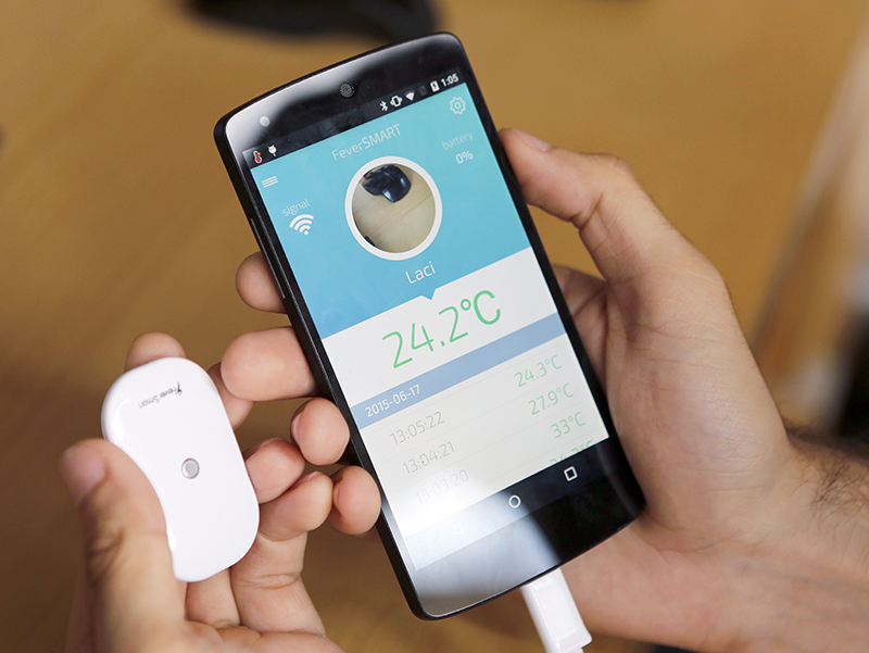 A technika csodájának nincsenek határai. Állapítom meg magamban, amikor Takács János elém tesz egy lázmérő csipet. Ezt egyszerűen lehet rögzíteni a beteg gyerek vagy felnőtt testén. A chip folyamatosan méri a lázt, a pontos értékek pedig egy app segítségével okostelefonon, tableten vagy asztali számítógépen követhetők. A beteg testén levő apró kis jeladó bluetooth kapcsolat segítségével kapcsolódik az eszközre. Riasztási értékek is beállíthatók, így a nővérek vagy a szülők egyszerűen értesülhetnek a páciens testhőmérsékletének változásairól.