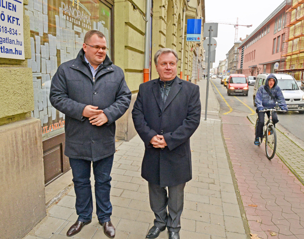 A győri belvárosi járdák újabb szakaszai kaptak térkő burkolatot, Fekete Dávid alpolgármester és Prédl Antal, az útkezelő szervezet vezetője szerdán délután 440 méternyi gyalogutat adott át hivatalosan is a forgalomnak.