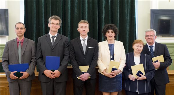 A Péchy Blanka-díjjal kitüntetett Türjei Attila, a Boglári Általános Iskola és Alapfokú Művészeti Iskola igazgatója (b) és Kiss László, a Boglári Általános Iskola és Alapfokú Művészeti Iskola igazgatóhelyettese (b2), a Kazinczy-díjjal kitüntetett Varga János, a közszolgálati rádió bemondója (b3), Szendrődyné Botka Krisztina, a balatonboglári Boglári Általános Iskola és Alapfokú Művészeti Iskola magyar tanára (b4), S. Forgács Anna, a budapesti Egressy Béni Református Művészeti Középiskola magyar-latin szakos tanára (b5) és Kovács M. István, a közszolgálati rádió bemondója  (MTI Fotó: Krizsán Csaba)