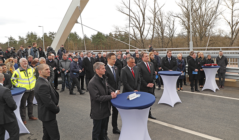 Szijjártó Péter külgazdasági és külügyminiszter visszautalt arra, hogy 2010-ben a város, a kormány és az Audi Hungaria Zrt. vezetői közösen beszélték meg, milyen beruházásokra van szükség Győr nemzetközi versenyképességének további fejlesztéséhez. Ekkor vetődött fel a péri reptér bővítése, s a keleti elkerülő út megépítése. A kormány, az önkormányzat és az Audi, valamint az autóipari cégek összefogásának köszönhetően Győr ma már Európa egyik járműipari fővárosa, fogalmazott a miniszter. Ehhez gratulált a város polgármesterének és országgyűlési képviselőinek. Szijjártó Péter arra is felhívta a figyelmet, hogy az új ipari forradalom, a digitalizáció, a motorizáció, az elektromobilitás hatalmas kihívás. Erre csak kiszámítható gazdasági környezettel, jól képzett szakemberekkel lehet megfelelni, Győr egyeteme és szakközépiskolái pedig gondoskodni tudnak a jó szakemberekről. Az infrastruktúra – köztük ez a nagyszabású beruházás – pedig logisztikai szempontból is kiszámíthatóvá teszi a termelést, ami a világcégek magyarországi anyagvállalatai szempontjából nagy versenyelőnynek számítanak. Szijjártó Péter szerint is nagyon fontos, hogy az új út és a híd jobb belső kapcsolatokat teremt a városban, mely végre jelképesen és szó szerint is fellélegezhet.