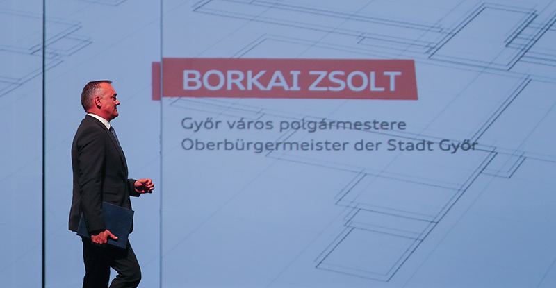 „Örülök, hogy az ötkarikás játékok bajnokaként egy olyan város polgármestere lehetek, amelyben a négykarikás Audi otthonra talált” – fogalmazott Borkai Zsolt polgármester. Utalt arra, hogy a város múltjában a járműipar mindig fontos szerepet játszott, a rendszerváltás után azonban új igények fogalmazódtak meg, és ezekre a csúcstechnológiát a városunkba hozó Audi segítségével reagálni tudtunk. Szólt arról, hogy az Audi a társadalmi felelősségvállalásban is élen jár, támogatja a kultúrát és az oktatást, nemes ügyeket karol fel, az önkormányzat megbízható, fontos stratégiai partnere. A polgármester köszönetet mondott a gyár dolgozóinak, valamint a magyar kormánynak, név szerint is megemlítve Orbán Viktor miniszterelnököt, valamint Szijjártó Péter külgazdasági és külügyminisztert, hogy versenyképes keretfeltételeket teremtettek az Audi magyarországi fejlődéséhez.