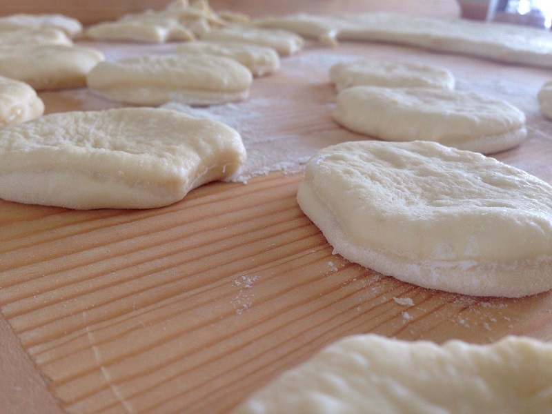 4- Mikor hólyagos, akkor kézzel, nem sodrófával kilapítjuk a nyújtódeszkára és lisztezett pohárral/bögrével szaggatunk belőle korongokat.