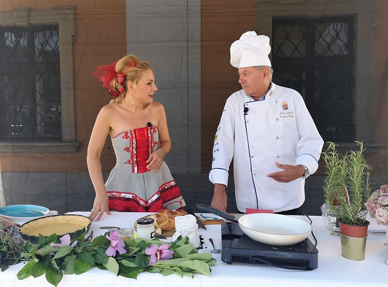 A déli harangszó után egy izgalmas gasztroshow vette kezdetét Szarka Zsófival, aki bevezette az érdeklődőket a 17. századi konyha rejtelmeibe. A helyszíni látványkonyhában ő maga is elkészített egy barokk finomságot, méghozzá a pástétomos pitét, miközben vendégeit, Kertics Adrienn dietetikust, Sátor László mesterszakácsot, illetve Nagy Róbert borászt faggatta. A dietetikus kiemelte, az egészség egyik kulcsa a napi ötszöri étkezés, valamint a minőségi alapanyagokból készült ételek fogyasztása. A mesterszakács néhány barokk receptet is felolvasott a nagyérdeműnek, hiszen úgy gondolja, érdemes visszatérni ezekhez az ételekhez. Nagy Róbert beszélt a színes borkultúráról, amelyet a barokk kor alapozott meg, akkoriban ugyanis a bor jelentette az egészséget.