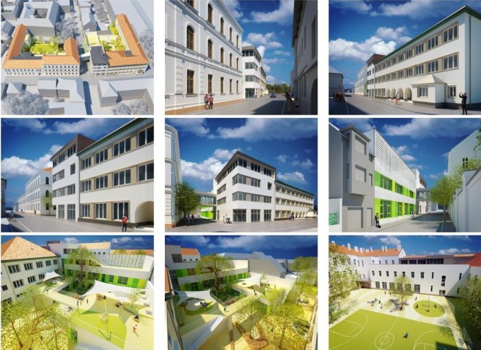 Új, többszintes óvodát építenek a régi Bástya utcai ház helyén, tetőteraszos játszóterekkel. A csoportszobákat a földszinten, egy üvegezett átrium köré szervezve alakítják ki. Az emeleten tornaszoba és kiszolgáló helyiségek kapnak helyet. Lebontják a jelenlegi gimnázium tornatermét, helyén, valamint a földszint bővítésével hatalmas közösségi teret hoznak létre. A tantermeket a Mosoni-Dunával párhuzamos szárny emeleti szintjén alakítják ki. A földszinten a szaktantermek lesznek. Az általános iskolát a jövőben egy folyosó köti össze a gimnázium épületével.