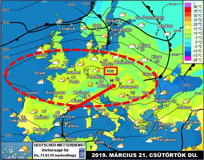 A hétfői hidegfront távoztával nyugatról magas nyomású zóna húzódik fölénk, a hét közepén napos, bár reggel fagyos időt hozva. A légnyomás szerdán-csütörtökön 1035 hPa körül tetőzik (3. ábra – a szaggatott ellipszis nagyjából az 1030 hPa-os izobárt követi, a nyíllal jelzett Győr pedig az 1035 hPa-os izobáron belül van). A frontok így messzi északi kerülőre kényszerülnek. De nem adják fel, a légnyomás csökkenésével a hét vége felé ismét „lejjebb” húzódnak, feltámasztva kissé az addigra már majdnem elfelejtett szelet.