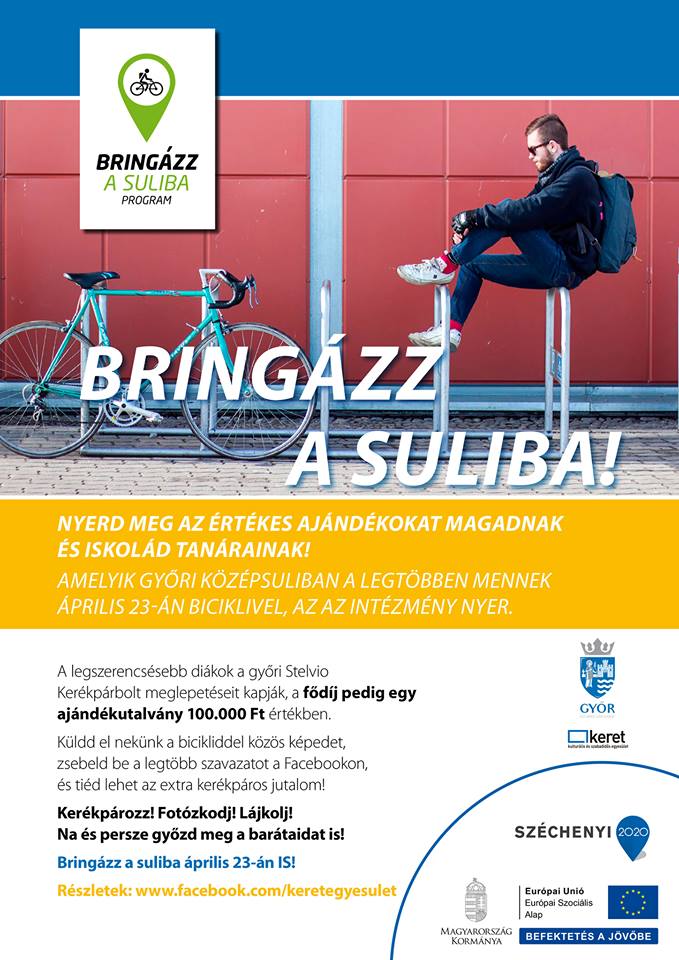 A Bringázz a Suliba! kampány Győr Megyei Jogú Város Önkormányzata és a Keret Egyesület szerezésében zajlik majd le, az ideje pedig április 23. hétfő. Minden győri középiskola jelentkezését várják a programba, amelynek végén értékes ajándékot nyer az-az intézmény, amely a legtöbb bringás diákot és tanárt küldte a rendezvényre. Ám nem csak ők kapnak ajándékot, hanem a tanulók egyenként is szerencsések lehetnek, ahogy a győztes iskola tanári kara is. Meglepik a legnépszerűbb facebook-os fotó tulajdonosát is, úgyhogy tényleg érdemes jelentkezni, amelyet még április 20-áig mindenki megtehet, a [email protected] címen. Kérjük, hogy az iskola nevét és a helyi szervező elérhetőségét (e-mail és telefonszám) minden esetben adjátok meg! A program helyszíne a jelentkező iskola biciklitárolója vagy bejárata.