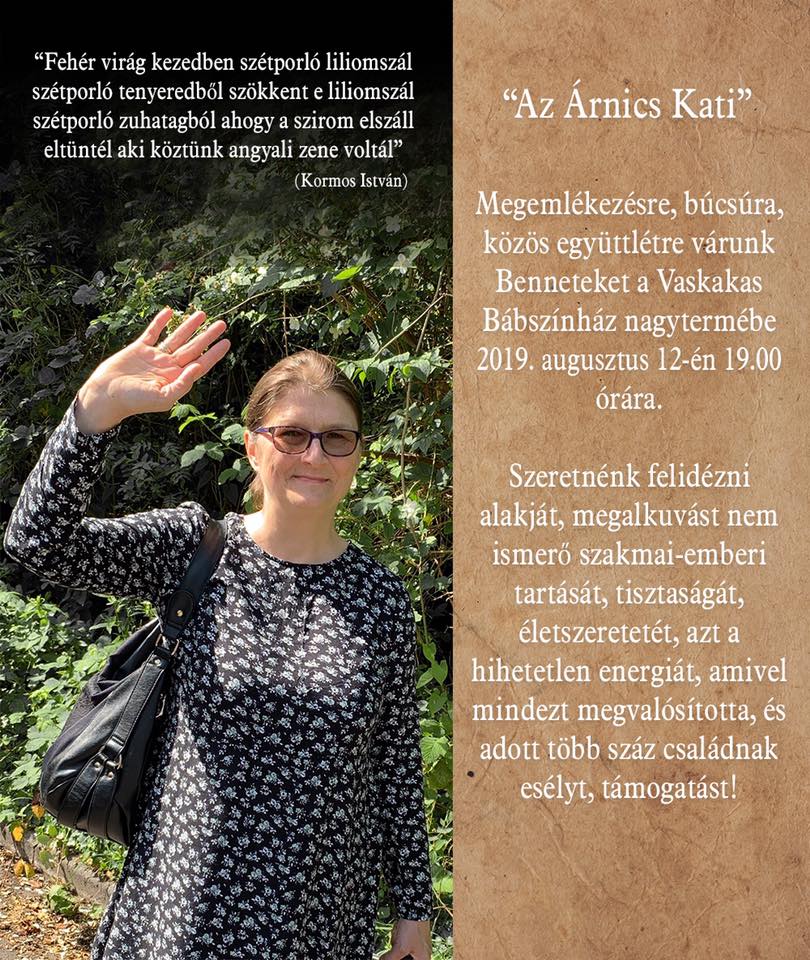 Árnics Katalin gyógypedagógiai tanár, pszichopedagógus, pedagógiai terapeuta július 3-án váratlanul elhunyt. Megemlékezésre, búcsúzásra, közös együttlétre várják mindazokat, akik ismerték Katit, augusztus 12-én, hétfőn 19 órára, a Vaskakas Bábszínház nagytermébe.
