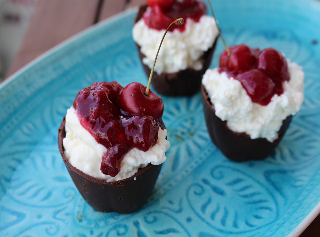 5 – Egy tányérra sorakoztatjuk a csokipoharakat, abba beletöltjük a túróhabot és a cseresznyeragut.