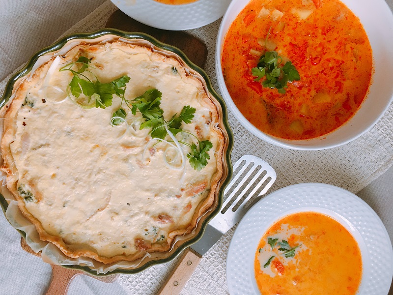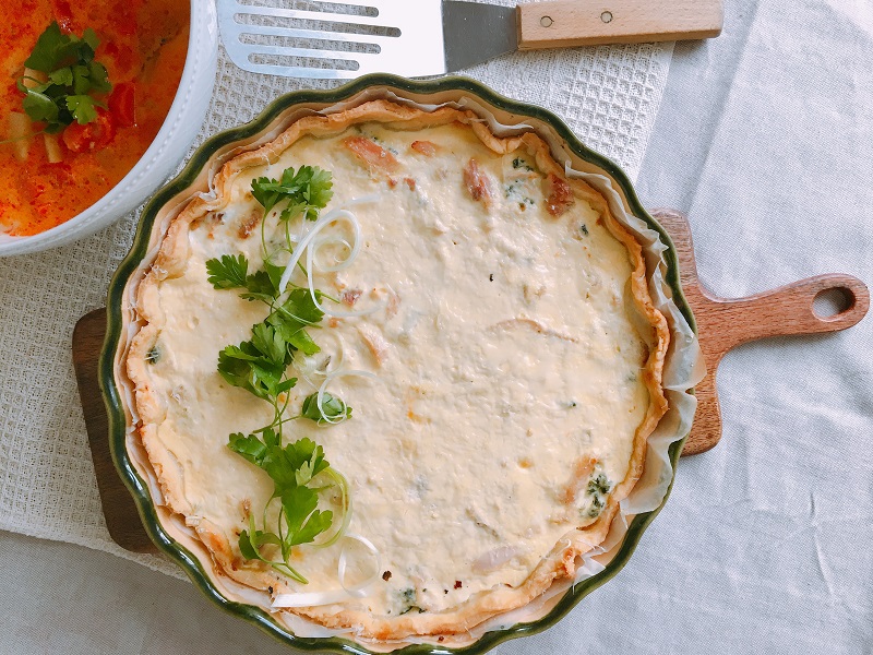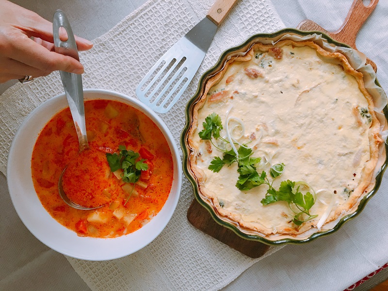 4. Kibélelem a sütőformát a tésztával, villával megszúrogatom, beletöltöm a masszát, majd előmelegített, 180 fokos sütőben 45 percig sütöm. Szeletelés előtt kicsit kihűtöm és a leves mellé tálalom.