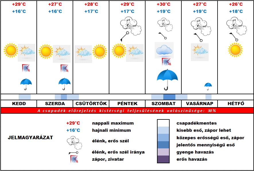 A hét első felében mindenesetre marad a fülledt meleg idő. Kedden kisebb, szerdán nagyobb eséllyel alakul ki Győr környékén zivatar. Nem fogunk fázni, a szél mérsékelt marad. A csütörtök valószínű felhősen indul, napközben azonban kiderül az ég és ez a tendencia valószínű péntek estig meg is marad. A hőmérséklet tovább emelkedik és szombaton ismét +30°C közelében alakul, péntek délután megerősödik a délnyugati szél. A jelenlegi „koncepció” szerint szombaton változás kezdődik. Egy alacsonyabb nyomású zóna húzódik fölénk, erősen megnövekszik a felhőzet és a zivatarok kialakulásának esélye. A szél északnyugatira fordul és megerősödik. Vasárnap és hétfőn már jóval kevesebb felhő lesz fölöttünk, azonban az északnyugati szél továbbra is élénk, erős marad. Megszűnik a fülledtség, a hőmérséklet az évszaknak megfelelően alakul. Jelentős fronthatással a hét folyamán nem kell számolni.