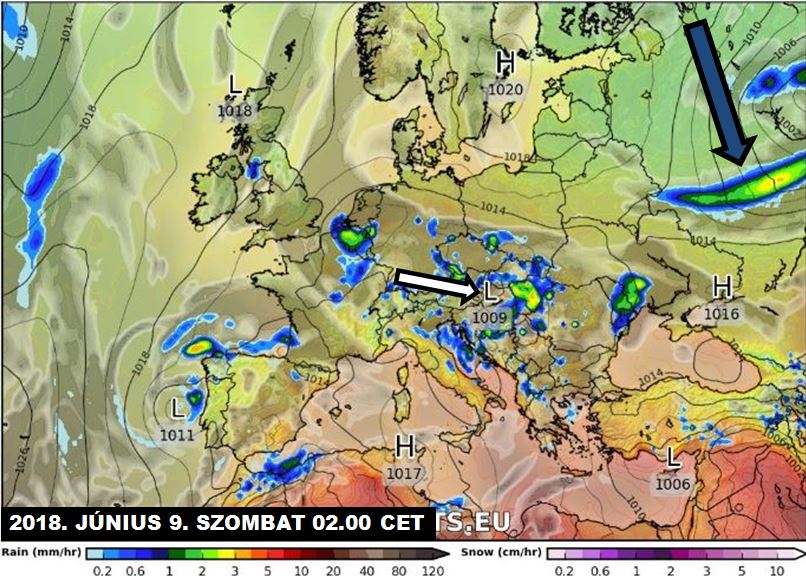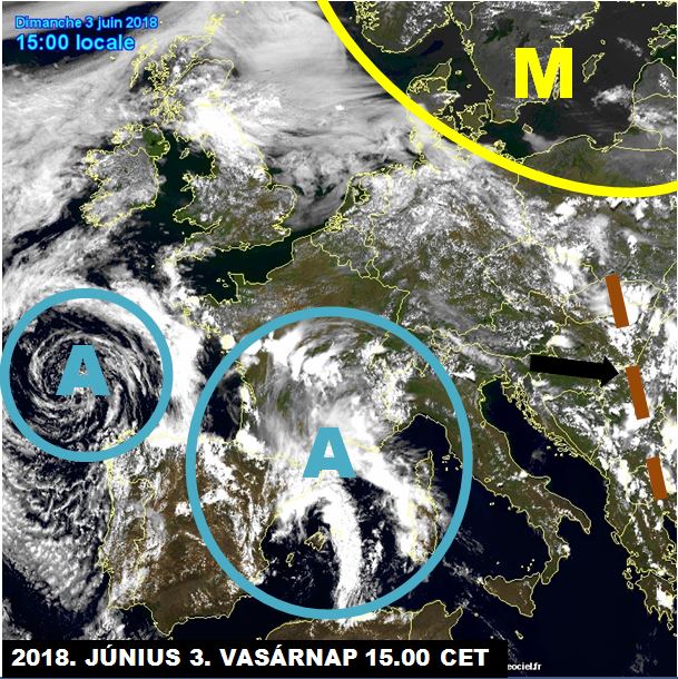 Közép-Európa e két öv találkozásának zónájában fekszik, ahol az összeáramlási vonalak határozzák meg a zivatarok, zivatarláncok kialakulásának helyét. Ilyet jelöl a barna szaggatott vonal, mely tegnap Kelet-Magyarországon át a Balkán-félsziget felé húzódott.