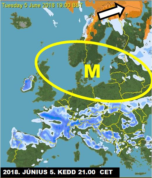 A 3. ábrán látható, hogy keddre az anticiklon az Észak-Európában Ny-K-i irányban mozgó és a telet ideiglenesen „visszavarázsoló” ciklonok nyomására délebbre helyeződik át. A Kola-félszigeten nyíllal jelölt zónában havazás, hófúvás várható. Mindennek eredményeképpen a Kelet-Európai-síkságon most már valóban frontok fognak mozogni, a szerdai fogja feltehetőleg növelni hazánkban a zivatarok kialakulásának valószínűségét. A dél felé húzódó anticiklon csütörtökön és pénteken hazánkban nyugodtabb időt biztosít.