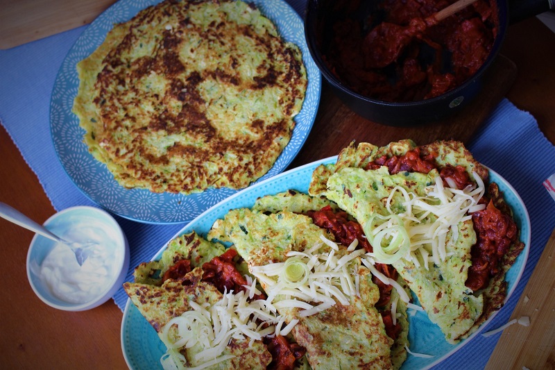 1. A cukkinit hámozva – vagy a nélkül is lehet – lereszelem, besózom 1 ek sóval, majd állni hagyom 10 percig. Kicsavarom belőle a vizet, kiöntöm, a cukkinihoz hozzáadom a tojást, tejet, lisztet, reszelt fokhagymát és összekeverem. Kevés olajon, forró serpenyőben nagy lepényeket sütök belőle.