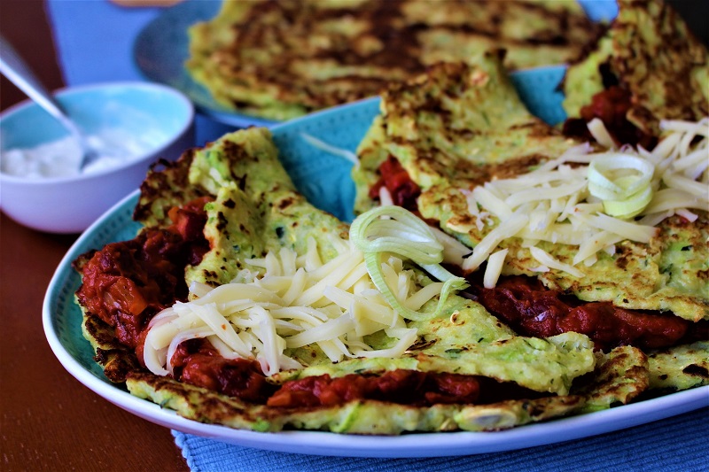 Azt vettem észre, szintén húsevő társammal egyetemben, hogy a vegetáriánus napok bevezetése igen jó hatással van ránk. Leginkább nyáron egyszerű ezt betartani, mert nagyon sok zöldség van és ízesek is. Nem vagyok híve a teljes vegetáriánus, vegán életmódnak, ahogy a nagy mennyiségű húsfogyasztásnak sem, éppen ezért váltogatom. A zöldségek áttisztítják a szervezetet, a gyomrot magas víztartalmuk miatt kímélik, és az emésztés pedig pillanatok alatt megtörténik. Nem csodálkozom, ha a tojásos leves és grízes tészta kombinációja nem a legjobb párosítás a húsevőknek, de vannak nagyon ízes, laktató és finom vegamenük. A húsban lévő fehérje fontos és tápláló, de vannak olyen típusú hüvelyesek, mint a bab, amiben kevés kalória, ám sok fehérje van. Ennek fogyasztása több energiát és kevesebb plusz kilót jelent majd. A tócsnit nálunk Felvidéken nagy, palacsinta méretűre készítik és görhönynek hívják, a szlovákok pedig különböző ragukkal töltik. Érkezem majd az eredeti pulyka szoté töltelékkel is, de most egy vörös babos verziót készítettem sok hagymával és fokhagymás cukkini tócsnival.