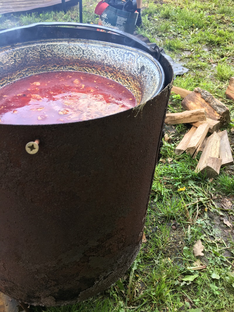A főzés közben nem felejtettem el, hogy más vidéken járok: más ízekre számítottam és módszerekre, ezért sokat kérdezgettem a főzések közepette. Kiderült, hogy tejföllel készült a tárkonyos raguleves, pörzsölt körömmel a bableves, sűrített paradicsommal a pörkölt szaftja, édesen a babgulyás és párolt káposztalevélben a gersli rizottó. Ez utóbbi mozgatta meg a fantáziámat leginkább, mert ritkán látok fehérborban főtt gerslit, ráadásul bográcsban. Nagyon jó gabonaféle, mert szaftos marad, mint a tarhonya, de nem ragad össze, jó hozzá a sok zsiradék is, de ha pl. savanyúkáposzta van közötte, már nagyon szaftos és tökéletes a hosszú, iszogatós estékhez – ezért kapták a különdíjat. A 2.helyre elegendő étel egy igazán gazdag cupákrengeteg volt: vaddisznóból, sertéslapockából és oldalasból.