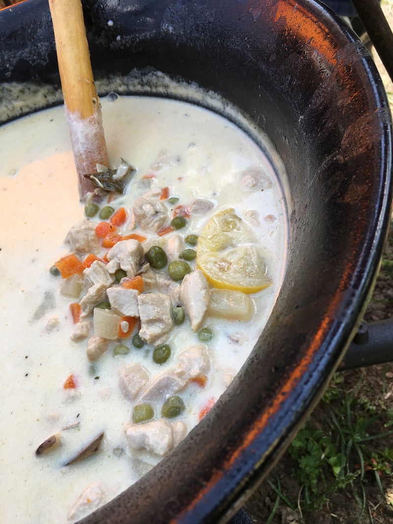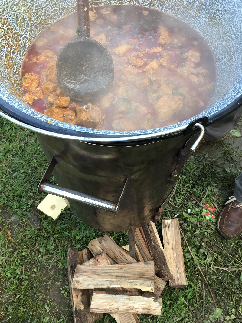 Rengeteg zöldfűszerrel (ami egyébként csupán a 2. helyet is okozta), de itt is levált a cupákról a hús. Fiatal, lelkes és egyben csinos lány állt kötényben a feltűnően egyedi fémedény felett és folyamatosan gondozta a szaftot. Őszintén szólva, már félúton gusztusos volt és a végén még az ott szaggatott nokedli adta meg a kegyelemdöfést. Az 1. hely ahhoz a csapathoz került, aki tíz éve versenyez és minden alkalommal a 2. helyen végez. Gomba, zöldborsó, zeller, petrezselyemgyökér, sárgarépa és fokhagyma több fázisban, került a fazékba a sertés darabkák közé. Először szkeptikus voltam, mert tokány hangulatom támadt – ezt a kifejezést felvesszük a szótárba – , de valójában csak a sok zöldség íze maradt benne a szaftban és ivódott bele a húsba. Apró kis kagylótésztával tálalták, amivel még nem ettem és nagyon megszerettük. Olyannyira, hogy az 1. helyre kerültek és azzal az örömmel, amivel a csapat hazament, talán értelmet is nyert az utóbbi 10 évük részvétele és az én érkezésem is erre a rendezvényre.