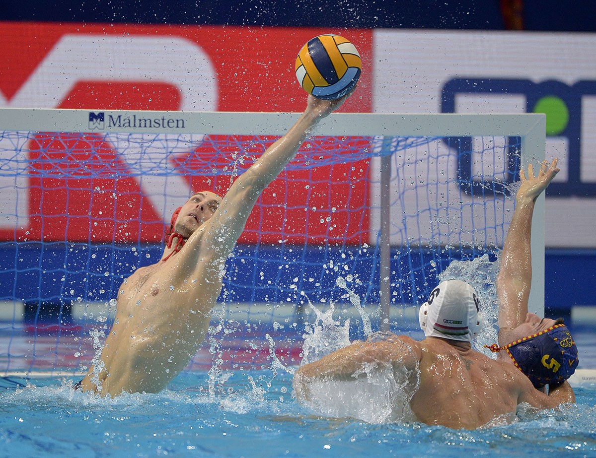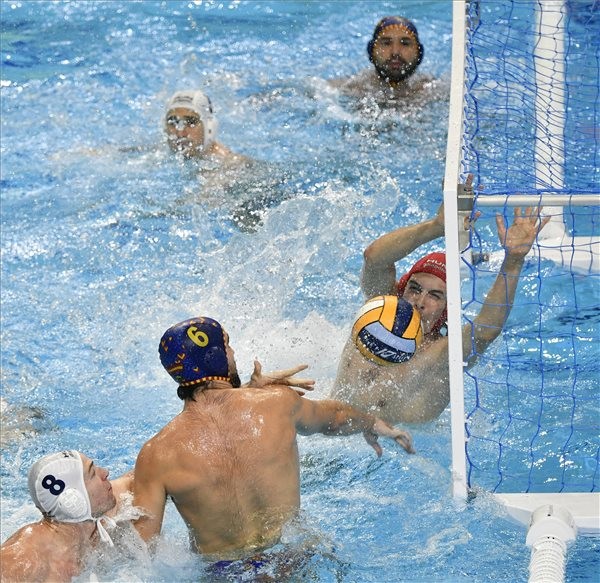 Rögtön az első támadásból vezetést szerzett a magyar csapat, amelynek kapujában Vogel Soma tempózott némi meglepetésre: Vámos Márton értékesítette az első emberelőnyt, a másodiknál viszont lövés közben kicsúszott a kezéből a labda. A következő magyar támadásnál a felúszó Pohl Zoltán használta ki, hogy az egyik spanyol lemaradt és elemi erővel lőtt a hálóba. A spanyoloknak kettős emberelőnyre volt szükségük a szépítéshez, az olimpiai bajnok Hosnyánszky Norbert viszont ugyancsak fórból gyorsan visszaállította a különbséget. A következő spanyol előnyt már éppen kivédekezte a magyar csapat, de Vogel védése után rossz helyre pattant a labda, a rivális pedig azonnal büntetett. Nem kellett sokat várni az újabb magyar gólra, fórban Varga Dénes tökéletesen tálalt Pohl kezére, aki magasan kiemelkedve húzott a kapuba (4-2).