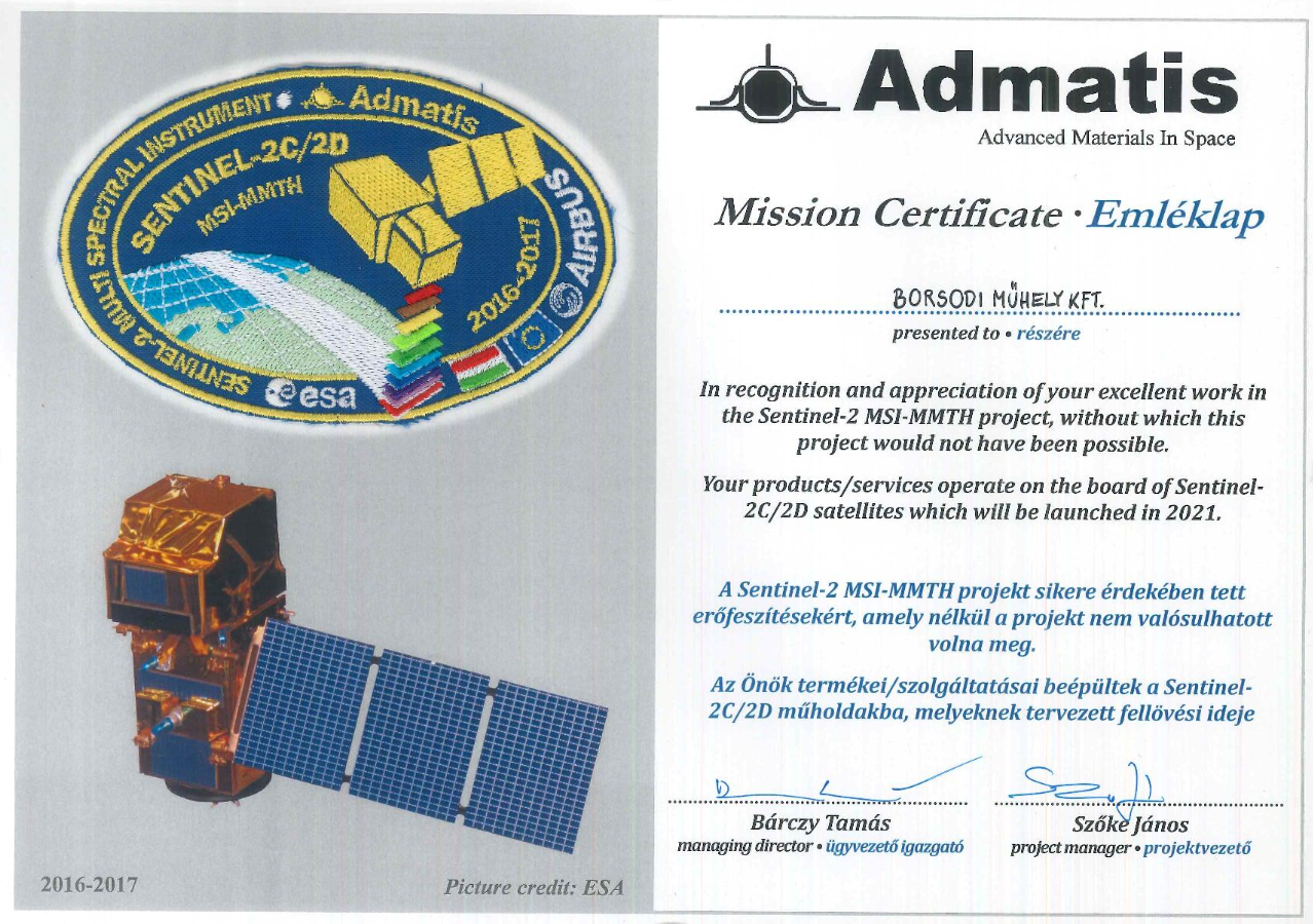 Talán még a repülőgépgyártásnál is érdekesebb a vállalat űripar felé nyújtott tevékenysége. A Borsodi legutóbb a Sentinel űrprogramba vett részt és gyártott alkatrészeket műholdakhoz, amelyek ma már a fejünk felett, az űrben szolgálják a távközlési és egyéb igényeket.