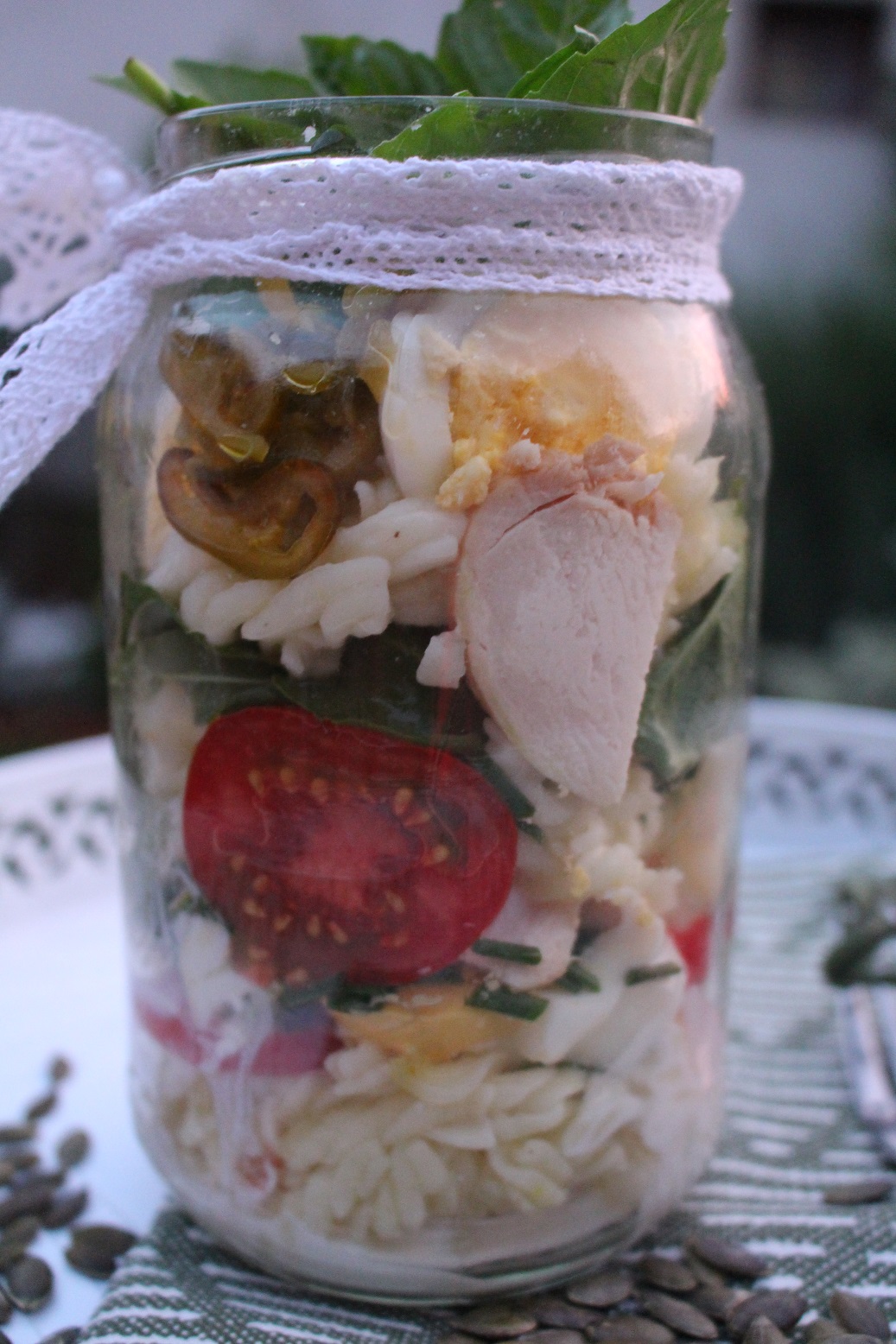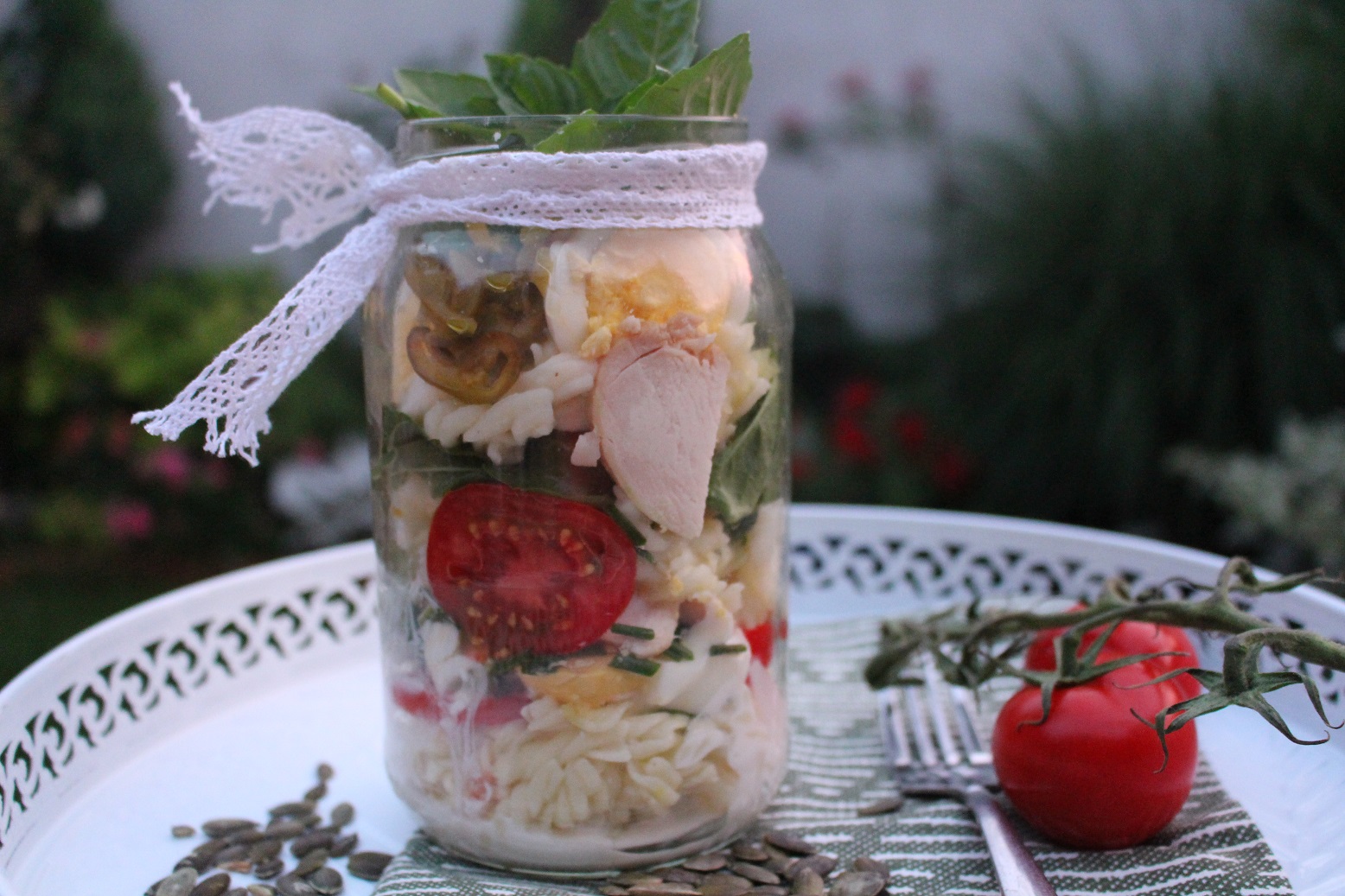 Csirke, főtt tojás, sok zöldség snidlinges kefiröntettel – azaz egy könnyű tésztaebéd elvitelre, ami hidegen és melegen is fogyasztható.