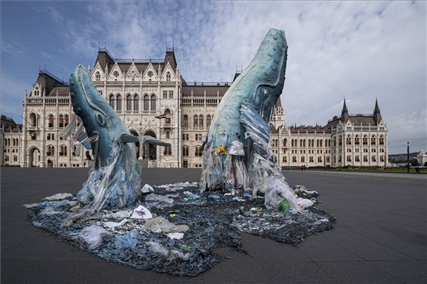 A Greenpeace műanyagszemét-tengerből kiemelkedő három és hat méter magas bálnákat ábrázoló installációjához nyolc olasz strandon gyűjtötték a szemetet. A több országban már kiállított bálnák két napon át lesznek láthatók Budapesten, kedden délig a Parlament előtt, szerdán pedig a Deák Ferenc téri templom előtt figyelmeztetnek a világunkat elárasztó műanyagszennyezésre. Az installációt ezt követően Lengyelországban állítják ki.