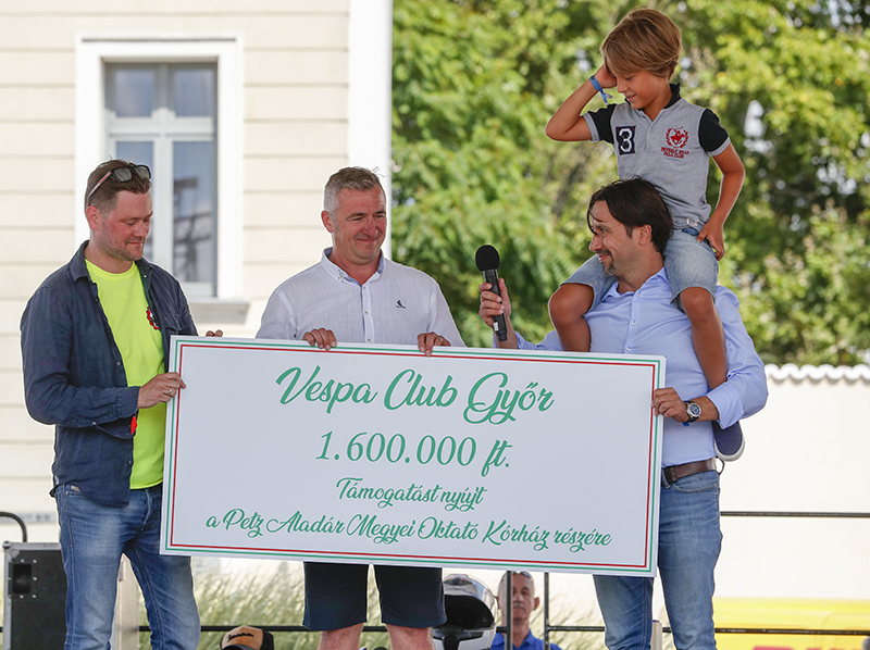 A szervezők részéről Vajthó Ádám és Borbély Barnabás szóltak a jelenlévőkhöz. Elmondták, hosszú út és sok munka vezetett a találkozóig, de végre sikerült elcsábítani Győrbe a motorosokat. A VESPARÁDÉ hátterében egy nemes cél is áll, hiszen az egyesület gyűjtést szervezett a Petz Aladár Megyei Oktató Kórház Gyermek Osztályának. 1.600.000 forintot gyűjtöttek, a befolyt összeget pedig a pénteki megnyitón át is adták dr. Issekutz Ákosnak, aki a kórház képviseletében volt jelen. „Ez az adomány a legjobbkor jött a kórháznak, hiszen a gyermek sürgősségi és gyermek traumatológia országosan teljes átrendezésre kerül. Hat országos és egyetemi centrumban indult meg a fejlődés, elsőként Győrben alakul meg a gyermek traumatológia és sürgősségi centrum” – mondta. Hozzátette, nagyon örülnek a nagyvonalú adománynak, hiszen a pénzt ennek a felszerelésére és különböző műszereire költik majd kiegészítésként.