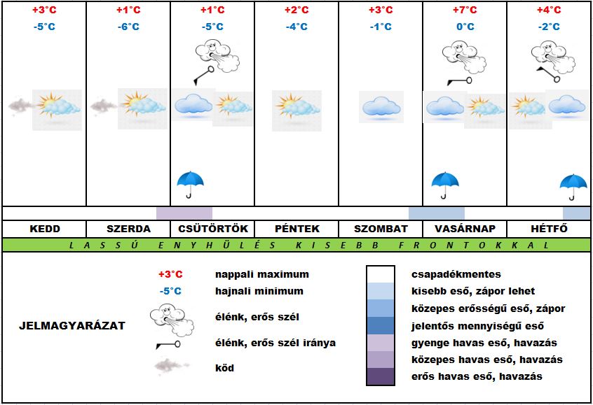 Fel vagyok tehát mentve. Így nyugodtan írhatom a metnet.hu nyomán, hogy a hazánk időjárását meghatározó három éghajlati hatás harcában a mediterrán gyengülni, az atlanti és a kelet-európai viszont küzdeni látszik, e héten az előbbi mérsékelt fölényével. Kedden és szerdán marad a nyugodt, hajnalban párás, csendes idő, közepes reggeli mínuszokkal és gyenge nappali plusszokkal. Majd szerdán DNy felől megélénkül a légmozgás és csütörtökön egy gyenge front hullathat némi havat, havasesőt. Pénteken változóan felhős idő várható, majd szombaton egy kissé erősebb front közelít meg bennünket, s a megélénkülő ÉNy-i szél mellett szombat este és vasárnap délelőtt eleredhet az eső, miközben a hőmérséklet emelkedik. A jelenlegi előrejelzések szerint hétfőn este egy most már tényleg komolyabb front közelíthet meg bennünket, melyből kedd hajnalban, reggel komolyabb mennyiségű eső hullhat.