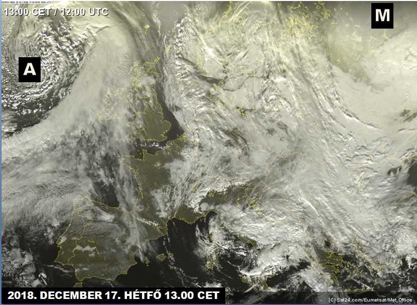 A 2. ábra hétfő délutáni műholdképén egy jobbára felhős Európára tekinthetünk, de minden”ki” a helyén van, az alacsony és a magas nyomású zóna is. Sőt az orosz fél még egy kráterfal-szerű barikádot is állított a globalizációs hatások próbálkozása ellen.