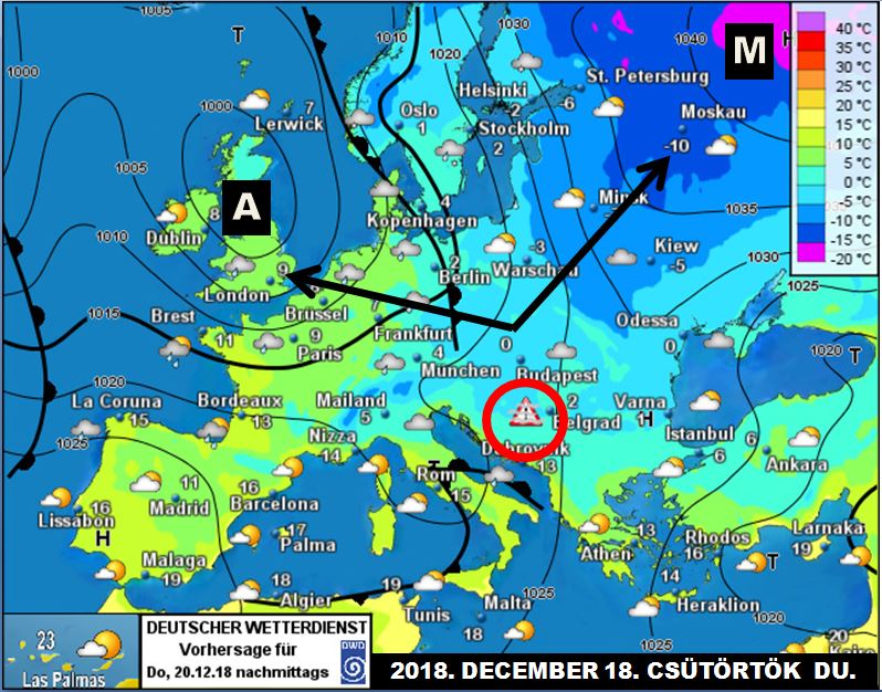 Magyarország a két egymásnak feszülő erő közt foglal helyet, a 3. ábra tanúsága szerint csütörtökön csaknem „félúton” a budapesti 0 ponttól London +9°C-ra, Moszkva pedig -10°C-ra található. Bár biztos nem „welcome”, de ebben az időszakban a Balkán-félsziget ÉNy-i része össztársadalmi korcsolyapályává fog válni (piros kör).