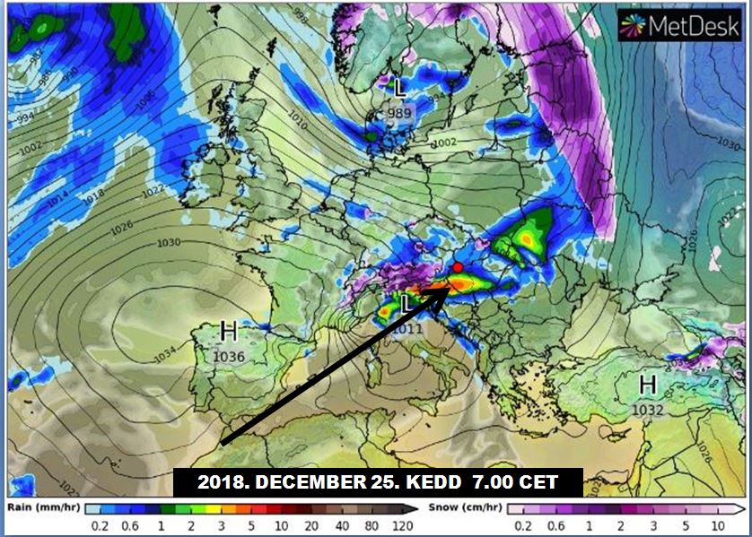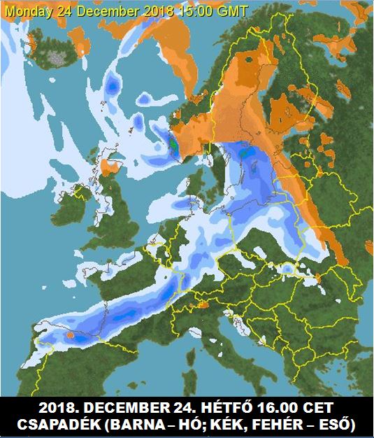 A 4. és 5. ábrák már egy kicsit túlzottan is előre mutatnak, a szenteste éjfélét közvetlen megelőző és követő időszakra. Ekkor egy erős atlanti hidegfront fog felettünk áthaladni. Egyik ábrán sem kell a meleg- illetve hidegfrontot megrajzolni, mert a csapadéksávok automatikusan kijelölik. Ami érdekes, de egyáltalán nem meglepő, hogy a havazás sávja a meleg-, az esőé pedig a hidegfrontot „húzza meg”.
